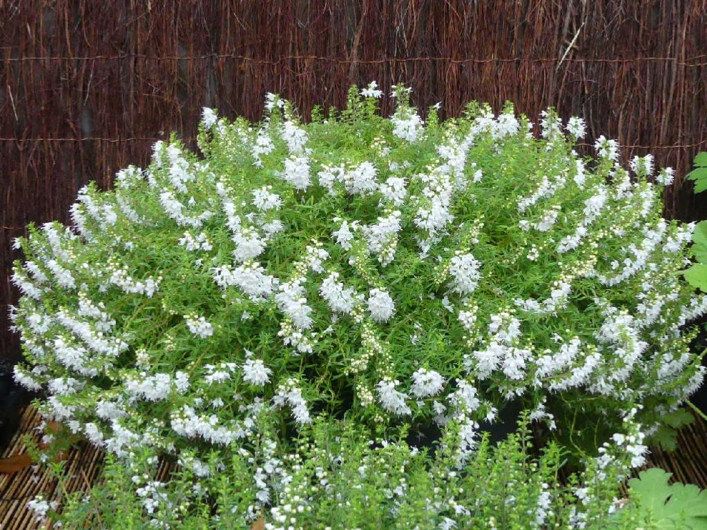 Myriade de petites fleurs blanches aux étamines bleu ciel, de la fin août à la Toussaint.