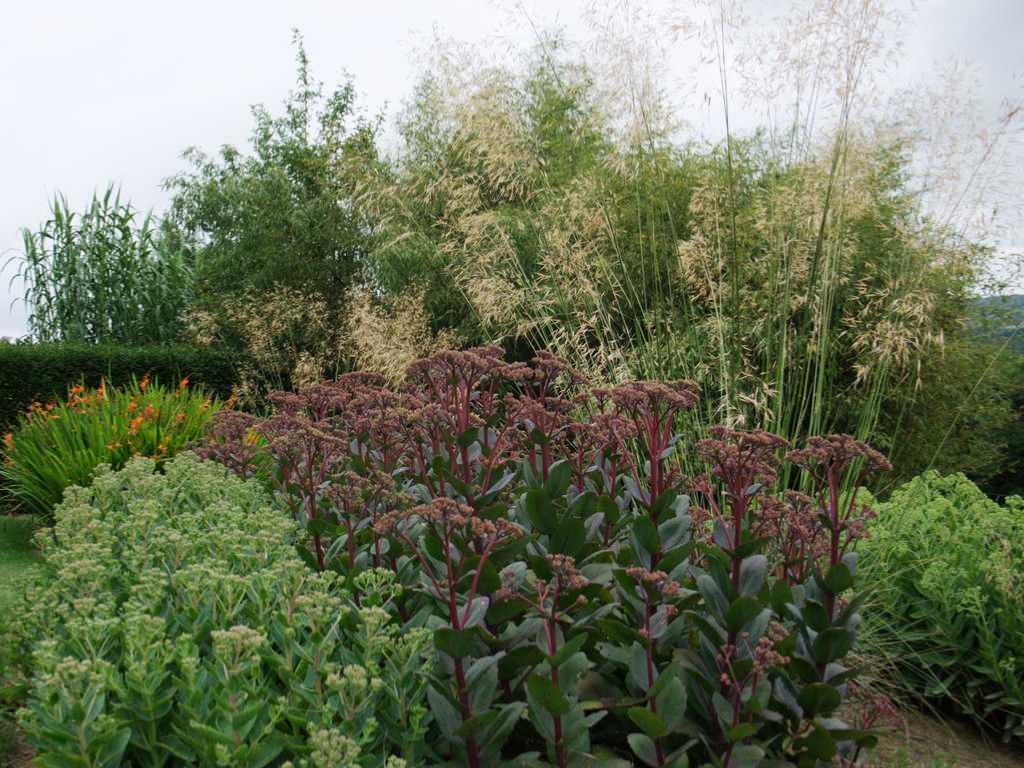 Fleurs pourpre rose, puis bronze de juillet à novembre.